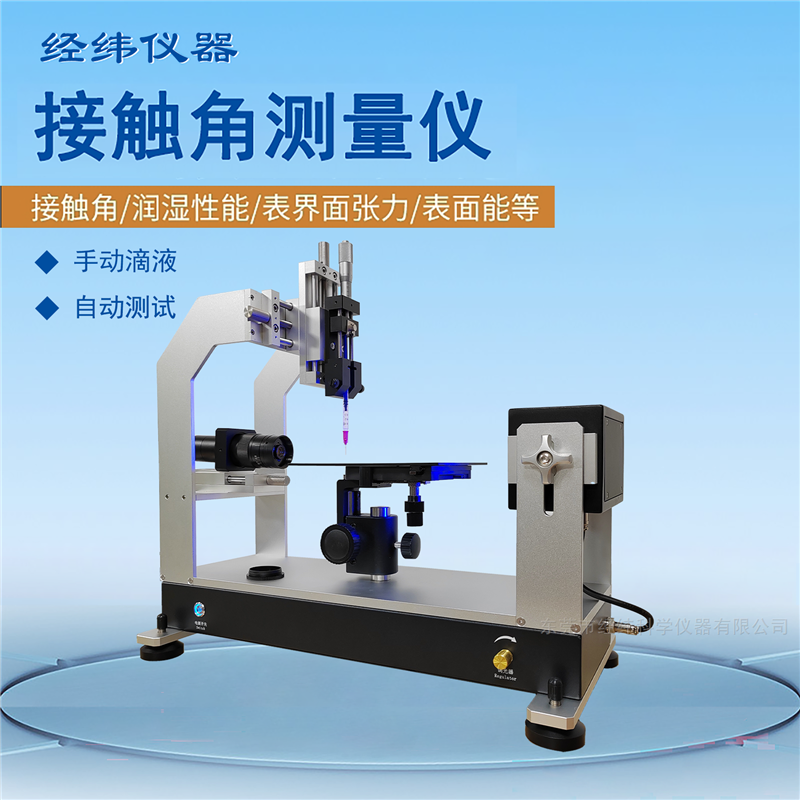接触角测量仪主要是由控制系统、注射系统、三轴移动样平台、视频采集系统、分析软件五大部分组成,设备采用光学投影原理。